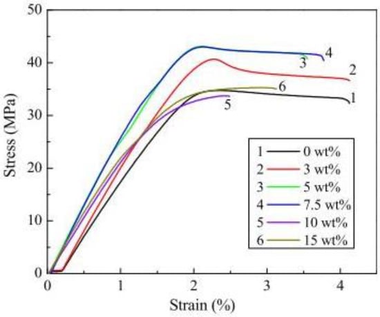 One of the recent works with FDM 3D printed discontinuous and randomly oriented-fiber composites was reported by Zhao et al. [91]. They compared the tensile properties of 3D printed CNT-short glass fiber (SGF) reinforced PLA composite with the tensile properties of 3D printed PLA, SGF/PLA, and found that both composites are better than neat PLA in terms of tensile strength and tensile modulus. In addition, CNT-SGF /PLA composite has a higher tensile strength than SGF/PLA composite. From the SEM images of the fracture surfaces of the composite specimens, they found that the fibers in the composites are randomly oriented. Su et al. reinforced polyamide with reclaimed carbon fiber in four different weight percentages (10%, 20%, 30%, 40%). They found that the fibers were better aligned at low fiber contents (10–20%) and had no significant alignment at 40%. They concluded that the tensile performance of the reclaimed carbon fiber reinforced polyamide composites (rCF/PA) largely depended on the fiber content and orientation, with higher fiber content and aligned fiber being able to improve tensile strength. All composites, including rCF/PA with 40 wt% and non-aligned fiber performed better than neat PLA [114].