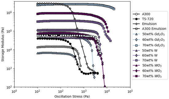 Rheological analyses results showing the storage modulus as a function of oscillation stress for representative samples of the DIW inks created in this study.