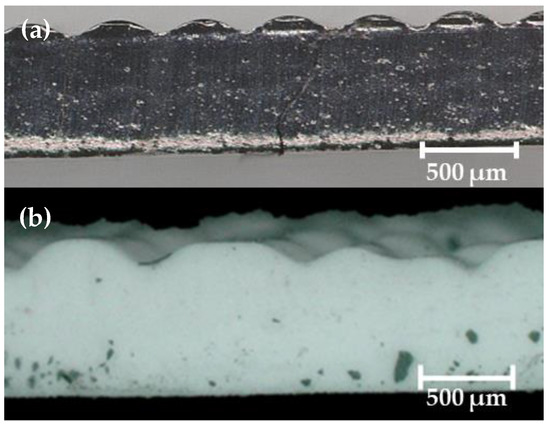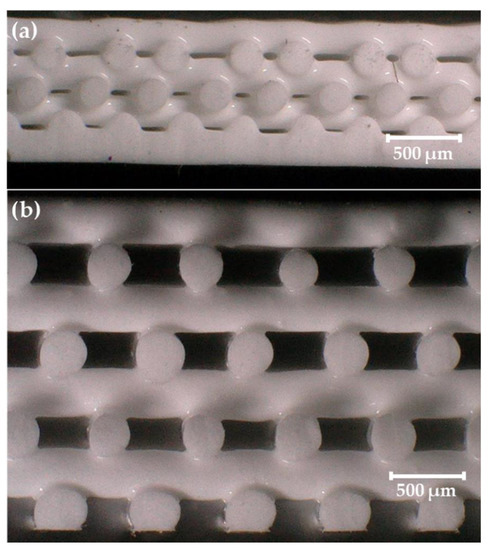 Side view microscope images of 60 wt% Gd2O3 FCT prints using: (a) a 250 µm nozzle with 500 µm center-to-center strut distance (η = 2) and (b) a 410 µm nozzle with 750 µm center-to-center strut distance (η = 1.829).