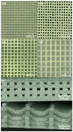 Top view microscopy images of SC parts printed with 50 wt% WO3 ink using a 250 µm nozzle at: (a) 500 µm or η = 2; (b) 750 µm or η = 3; (c) 1000 µm or η = 4; and (d) 1500 µm or η = 6. Side view microscopy images (50×) of SC parts printed with 50 wt% WO3 ink using a 250 µm nozzle showing stable vs. sagging struts in prints with spacing: (e) 500 µm or η = 2; and (f) 1500 µm or η = 6.