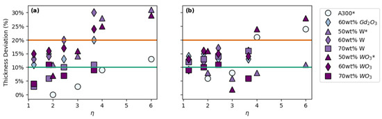 Overall thickness deviation vs. spacing ratio (η) for prints with: (a) FCT geometries and (b) SC geometries. * Data in plot (a) from Brounstein et al. [19].