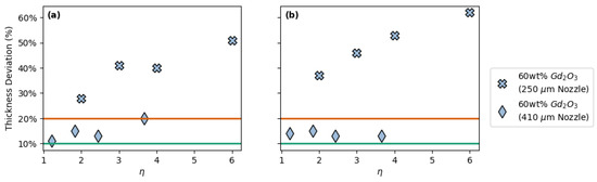 Overall thickness deviation vs. spacing ratio (η) for 60 wt% Gd2O3 prints using 250 µm and 410 µm nozzles with: (a) FCT geometries and (b) SC geometries.