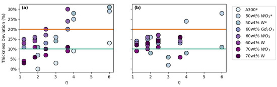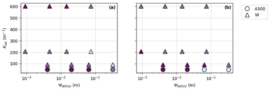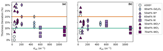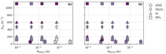 Subset of data points from Figure 9 showing ink rheology (Kink) vs. lattice parameter (Ψlattice) for A300 and tungsten-filled: (a) FCT prints and (b) SC prints. The darkest symbols represent pads with <10% thickness deviation; the second-darkest symbols represent pads with <20% thickness deviation; and the lightest symbols represent pads with >20% thickness deviation.