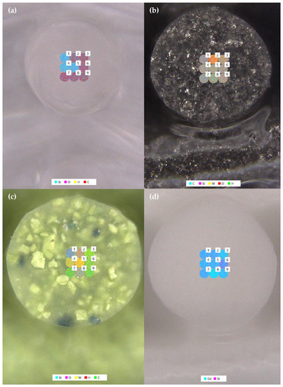 In contrast to the prints made with silica- and metal-filled inks, prints made with tungsten oxide-filled inks have easily distinguished, sharp particles in varying sizes, suggesting a more heterogenous mixture of filler and PDMS in the resin (Figure 11c and Figure 12c). This is confirmed by the elemental distributions displayed in Figure 12c, which show distinct high-concentration areas of silicon (spot 1), tungsten (spots 4–5), and carbon (spots 3, 6–7, and 9) mixed with oxygen and hydrogen, likely representing fumed silica, tungsten oxide, and PDMS, respectively. Only spots 2 and 8 (Figure 12c) show a more even mixture of all components of the tungsten-oxide ink. When looking at the images of prints made with gadolinium oxide-filled ink, particles appear to be very homogenous and evenly distributed throughout the resin (Figure 11d). While individual particles are difficult to distinguish, the granular appearance of the printed structure suggests that the gadolinium oxide filler is relatively rough compared to the fumed silica or tungsten metal. The elemental maps in Figure 12d show a very homogenous mixture of gadolinium and silicon, though no other elements were detected, suggesting that the signals for elements representing the PDMS resin were overwhelmed by those representing the gadolinium oxide and fumed silica fillers. Based on these findings, rough or sharp filler particles, heterogenous filler particle sizes, and/or suboptimal polymer-filler interactions may contribute to poor and/or unpredictable ink printability.