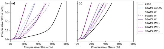 Compressive stress–strain curves for DIW pads with 500 µm center-to-center distance between struts printed with: (a) FCT lattice geometry and (b) SC lattice geometry.