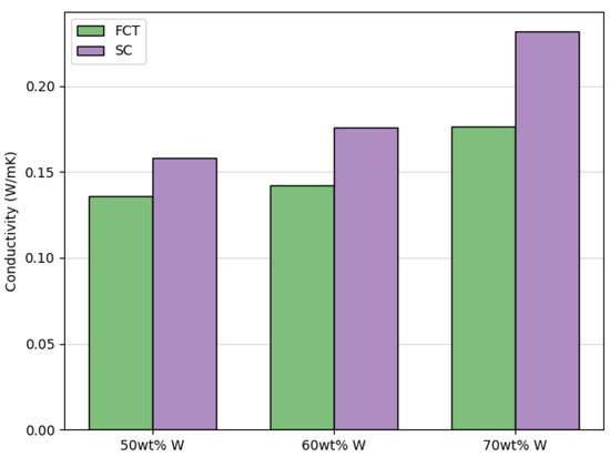 Another potentially tunable characteristic of DIW printed parts is thermal conductivity. Because metals, in general, have better conductivity than silicones and ceramics, thermal conductivity was only investigated for printed pads made with tungsten metal-filled inks. To determine the effects of filler concentration and lattice geometry on thermal conductivity of the tungsten metal-filled prints, pads with the same center-to-center distance between printed struts (500 µm) were analyzed for each filler concentration (50 wt%, 60 wt%, or 70 wt%) and lattice geometry (FCT or SC). In Figure 14, one observes an increase in thermal conductivity with increasing filler concentration as well as a trend of greater conductivity in prints with SC lattice geometries than prints with FCT lattice geometries. The increase in thermal conductivity with increasing metal concentration is intuitive, but the higher thermal conductivity of SC prints compared to FCT prints is not.