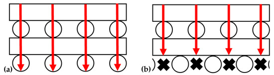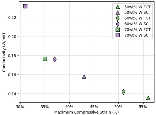 The instrument that was used to measure thermal conductivity applies a pressure of 60 psi to printed parts during analysis, which roughly corresponds to the maximum compressive stress applied to printed parts during compression analyses (0.4 MPa). Because of this, the relationship between the conductivity and the maximum compressive strain of the pads analyzed in Figure 14 was investigated (Figure 15). This analysis shows a negative correlation between thermal conductivity and maximum compressive strain, which contradicts previous findings [19] and suggests that another factor may be contributing. Conductivity heavily depends on the connectedness of the path from source to sink, which is why more compressed structures showed higher conductivity in [19]. However, in an SC lattice, there is a more direct path from source to sink compared to FCT lattice structures where conductivity is inherently obstructed by more air voids regardless of the level of compression (Figure 16). Therefore, with the same metal filler concentration, an SC printed lattice will be more thermally conductive than an FCT printed lattice.