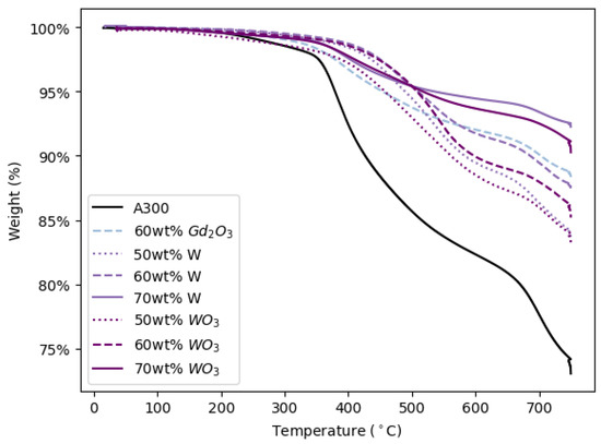 The final thermomechanical analysis performed on DIW pads printed in this study was TGA. Figure 17 shows the TGA curves for representative printed samples of all ink formulations able to be printed. This figure, as well as Table 6, illustrate that the onset of thermal degradation (Td5%) for A300 printed pads is significantly lower than that of the metal- and ceramic-filled pads and that the Td5% and final mass (mf) of metal- and ceramic-filled pads increase with increasing filler concentration, confirming that the addition of fillers other than fumed silica to DIW inks increases the thermal stability of the ink as reported in [19]. Additionally, except for the 60 wt% pads, the metal-filled inks appear to be more thermally stable (lower Td5% and higher mf values) than their ceramic-filled counterparts (Figure 17 and Table 6).
