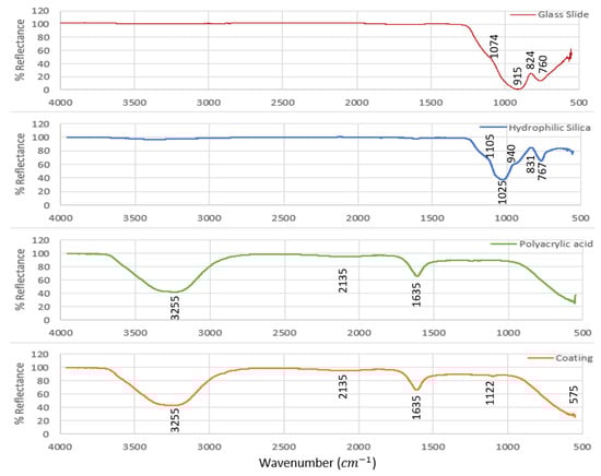 FTIR spectra of the glass slide, hydrophilic silica, polyacrylic acid and coating with particle loading 95 vol. %.