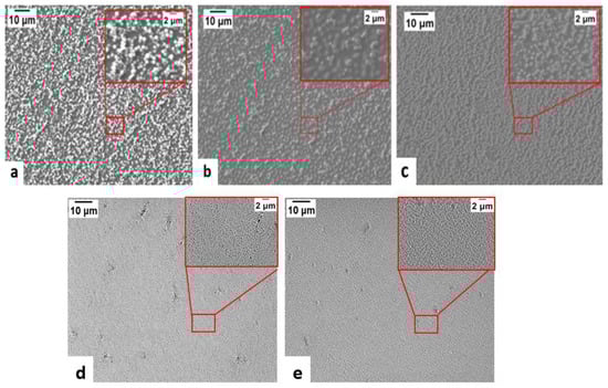 SEM images of coatings with particle loading (vol. %) of (a) 37, (b) 53, (c) 70, (d) 77, (e) 84. The inset is zoom-in SEM image.