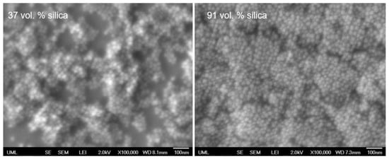 The microstructure of the coatings with different particle loadings was observed by FE-SEM (Figure 4 and Figure 5) It can be seen from Figure 4 that the coated surfaces are uniform and have well distributed silica particles at micro scale. In addition, the coating is composed of silica aggregates with sizes around 1 µm (particle size of the silica in the colloidal solution is around 22 nm) [,]. This agglomeration may be attributed to the destabilizing effect of PAA on the silica colloidal suspension system by reducing the negative surface charge on the silica NPs and changing the pH []. Figure 5 shows the effect of particle loading on packing. It was clearly seen that the packing was improved for high particle loading coatings. The SEM cross section images of the coatings are given in Figure S2. The thickness data of the coatings is presented in Table S1.
