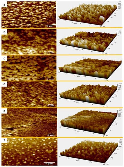 The roughness factor listed in Table 4 was calculated by taking the ratio of the actual surface area over geometric surface area, which were obtained from XEP software, PSIA Corp., Sungnam, Korea. The Ra and Rrms values were directly obtained from XEP software. It is interesting to note that increasing the particle loading decreased the roughness factor value, which is in contradiction to literature reports []. This may be related to decreased agglomerate size as particle loading increases.