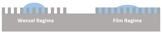 To explain the results, the different wetting regimes should be analyzed. For a hydrophilic rough surface, the liquid drop may interact by two ways: by assuming Wenzel regime or film regime [] as shown in Figure 7. The Wenzel model assumes that the space between the asperities on the surface is filled by the liquid and the drop is strongly pinned by the roughness. For the thermodynamically stable state, the intrinsic angle of the smooth surface should be larger than the critical angle (θc), which is roughly determined by the roughness factor value (r). In the case of intrinsic angle being smaller than θc, the roughness is impregnated and part of the liquid is imbibed [], resulting in the water drop standing on a surface composed of solid and liquid (shown as film regime in Figure 7).