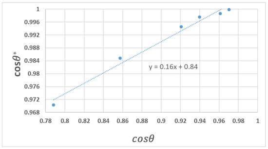 Thus, the relationship between cos and , using the values in Table 5, is shown in Figure 8. A nearly linear relationship between cos and is obtained which follows Equation (4). By fitting the experimental data to Equation (4), the constants are obtained. For this system the calculated value of is 0.16. For superhydrophobic surfaces, both the experimental and theoretical value is reported [,] and is well known. While 1 is expected in many cases [], to the best of our knowledge, there are no reports of the experimental solid fraction value for superhydrophilic surfaces. Fernández-Blázquez et al. [] correlated an area fraction of the solid–liquid interface to the top area fraction and observed that these two values were similar. In their study, the top area fraction of the plasma treated superhydrophilic (CA almost 0°) samples was reported as 12%, which is similar to the value obtained in this paper (0.16).