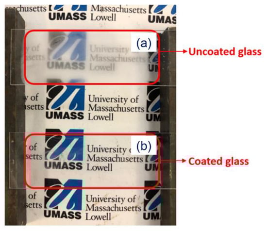The cold fog test was performed to assess the antifog performance of the coatings [,]. The images in the humidity chamber for the fog evaluation are shown in Figure 9. The coated glass (b) successfully prevents fog formation, while the uncoated bare glass (a) area is fogged.