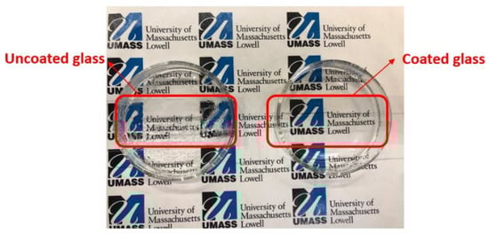 Another test conducted to assess antifog performance of the coatings was the boiling test [,]. The coated and uncoated glass samples placed on a Petri dish containing hot water is seen in Figure 10. The coated area prevented fog formation and allowed the letters to be easily seen by the naked eye. The uncoated area was fogged and resulted in a loss of visual clarity by restricting the light transmission.