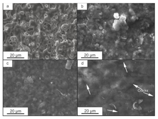 SEM images of the surface of samples with PEO coating (a), CC 1X (b), CC 2X (c), and CC 3X (d). Arrows indicate cracks.