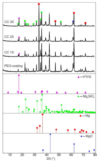 According to XRD data, the PEO coating contains periclase (MgO JCPDS Card No: 00–045–0946) and forsterite (Mg2SiO4 JCPDS Card No: 01–084–1402) (Figure 2). The presented compounds were formed from electrolyte components and a metal substrate in the process of PEO under the action of microdischarges [33]. The diffraction pattern of the composite coating with a single application of a fluoropolymer (Figure 2) contains PTFE (JCPDS Card No: 01–047–2217) peaks, which indicate the incorporation of the polymer into the PEO coating during the formation of composite layers.