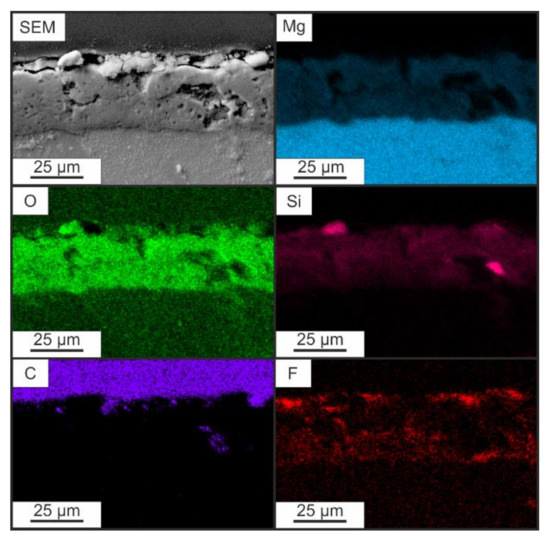 The distribution of elements over the thickness of the composite coating (CC 3X) was studied by the EDS of the cross-section (Figure 3). The relatively uniform distribution of elements such as Mg, Si, and O over the coating’s thickness is the result of the interaction of the metal substrate and the electrolyte during plasma electrolytic treatment. The distribution of SPTFE components C and F over the thickness of the CC 3X indicates the filling of the pores of the PEO layer and the formation of an additional protective barrier layer on its surface (Figure 3). Thus, the formed composite coating isolates the metal substrate from the environment.