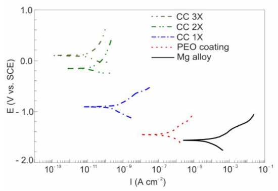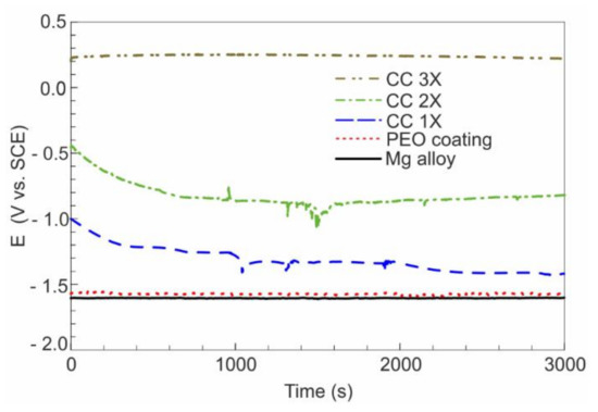 The highest electrode potential was recorded for the sample with the CC 3X. Stable potential values of approximately 0.25 V are observed throughout the entire time of the experiment, in contrast with other samples with composite coatings (Figure 4). This behavior of the electrode potential is an aftermath of the full filling of the porous part (pores and defects) of the PEO layer with polymer and the formation of a continuous polymer-containing layer (Figure 1d and Figure 4).