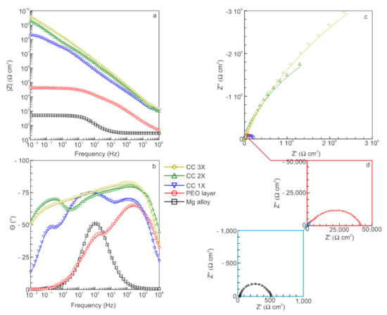 Bode plots (dependence of the impedance modulus |Z| (a) and phase angle θ (b) on frequency f) and Nyquist plots (dependence of the imaginary part of the impedance Z″ on the real part of the impedance Z′) (c,d) obtained for bare alloy, PEO layer, and composite coatings. The symbols represent the experimental data, and the lines are the fitting curves calculated according to the EEC.