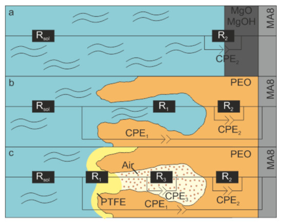 Modeling of surface layers and corresponding equivalent electrical circuits obtained by fitting experimental data on impedance: (a) magnesium alloy with single R–CPE chain, (b) PEO coating with two R–CPE chains, and (c) three R–CPE chains for composite coatings.