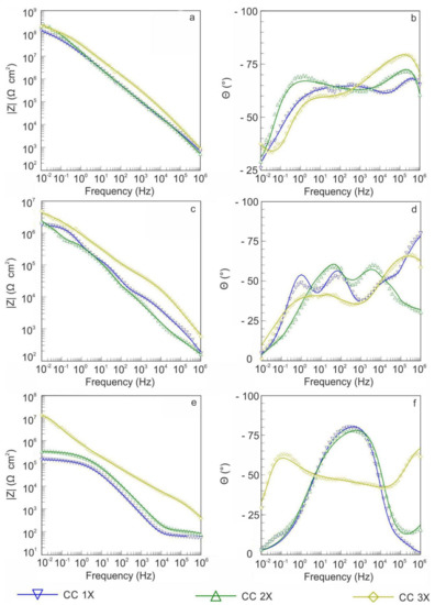 Also of interest is the increase in the performance of the |Z|f = 0.01 Hz after 72 h of the experiment for CC 3X (Figure 8, Table 3). On the basis of the analysis of SEM images, it can be concluded that the electrolyte can penetrate through a small number of cracks (Figure 1d) to the substrate material. Formed corrosion products filled the pores and blocked access to the substrate. Furthermore, since the number of defects on the surface of CC 3X is extremely small, after formation of corrosion products at the bottom of the through pores, the values of the impedance modulus increased (Figure 8, Table 3).