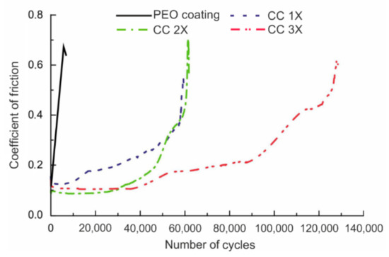 The wear features of CC 2X is distinguished by the presence of three stages (Figure 9). The first stage is a consequence of the presence of a polymer film on the surface of the composite coating, which reduces the coefficient of friction (Figure 9). Further, starting from ~50,000 cycles, the stage of wear of the composite-polymer-containing (porous outer part) layer begins. Then, as in the case of CC 1X, a sharp rise in the coefficient of friction is observed, associated with the complete destruction of the inner part of the coating not containing polymer (Figure 9).