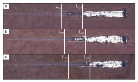 Optical images of scratches on the surface of CC 1X (a), CC 2X (b), and CC 3X (c).