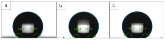 According to wettability tests, the coating with PTFE applied to its surface showed higher hydrophobic properties than the unmodified PEO layer. Thus, after a single treatment with a fluoropolymer of a hydrophilic PEO coating, the resulting composite coating acquired hydrophobic properties. The contact angle (CA) reached values of 149° (which is 100° more than that of the base PEO coating) (Table 5, Figure 11). For CC 2X, the CA reached 157°. With a further increase in the multiplicity of application of the fluoropolymer material, there was a reduction in CA (Table 5), which was caused by a change in the surface structure, a decrease in its roughness, and the appearance of a more uniform layer morphology (Figure 1c,d).