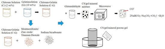 Figure 1 shows the procedure for producing porous gel. CS and gelatin mixture was first made as follows. A 2 v/v% ethanoic acid and 2 wt% CS solution were heated to 60 °C and simultaneously mixed for twelve hours. CS solution and gelatin solution were blended with a volume ratio of 9:1 and constantly stirred for 4 min at 45 °C. Next, 1 v/v% glutaraldehyde (GA) solution was stirred at 25 °C for 5 min, after which 0.1 wt% of MMT, ZnO, or TiO2 was added to the CS/gelatin mixture, respectively, followed by 0.02 g of sodium bicarbonate. The mixtures were heated to 55 °C and mixed for 3 min, and then 5 mL of GA solution was incorporated and mixed for 1 min at 55 °C using magnetic stirrers. The final mixtures were kept still at 55 °C on the mixer for another 4 min. The denotations and specifications of samples are listed in Table 1 and Table 2. The final mixtures were then placed in a microwave oven (NN-SM33H, PANASONIC, Fukushima, Osaka, Japan) with an output of 800 W for one minute, and the optimal porous gel was determined accordingly.