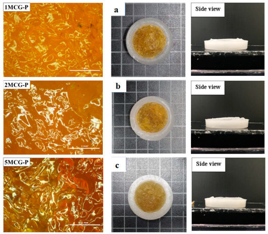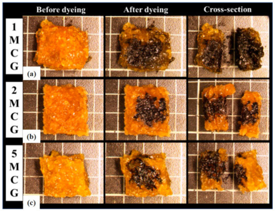 With the same light source, Figure 2a–c compares different porous gels and 1MCG has a darker shade than 1ZCG and 1TCG, which is primarily because of the dark shade of MMT. By contrast, 1ZCG has a shade that appears white because of the original color of TiO2. Despite the shade of the three mineral types, all samples exhibit an even tone, which suggests that the mineral powders can be evenly dispersed in the CS/gel mixtures without causing precipitation or agglomeration. Therefore, the surface observation substantiates that the manufacturing process is stabilized.