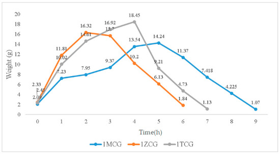 In Figure 4, the swelling weight from 0–0.17 h is used as an initial record because samples are immersed for ten minutes when they start to show a distinctive swelling level. When immersed for 0.17–1 h, the swelling weights of 1MCG, 1ZCG, and 1TCG soar, especially 1ZCG. Conversely, 1MCG exhibits a mitigated raise comparatively. When the immersion time is 1–2 h, the swelling weight of all samples still spikes and 1MCG still remains the lowest rise rate. With an immersion time of 2–3 h, the swelling weight of 1ZCG mildly descends whereas the swelling weight for 1TCG and 1MCG still climbs. With an immersion time of 3–4 h, the swelling weight of 1ZCG drops drastically, but the swelling weight of 1TCG slightly increases, and the swelling weight of 1MCG increases more than that of 1TCG. When the immersion time is 4–5 h, 1TCG has an even lower swelling weight and also starts decomposition, whereas 1MCG still has an increasing swelling weight. With an immersion time of 5–6 h, both 1ZCG and 1TCG are decomposed while 1MCG has a swelling weight that starts descending until the 9th hour when 1MCG is totally decomposed.
