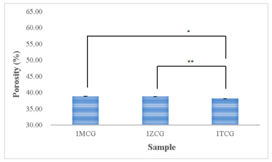 Figure 5 shows that the porosity is 38.854% for both 1MCG and 1ZCG, and 38.174% for 1TCG. In the study by Pandithevan et al., the yielded cortical bone porosity was 40–60% [26,30]. In other words, the three types of CS/gel/mineral porous gels have comparable porosity. Figure 6 compared with Figure 4 indicates the interconnectivity of pores. The comparisons suggest that the porosity is not high but the three types of porous gel all demonstrate a good structure with interconnected pores. In addition, the pore diameter distribution is between 40% and 60%, showing an evenly distributed pore diameter, the results of which demonstrate the same trend that is found in the previous study [26,31].