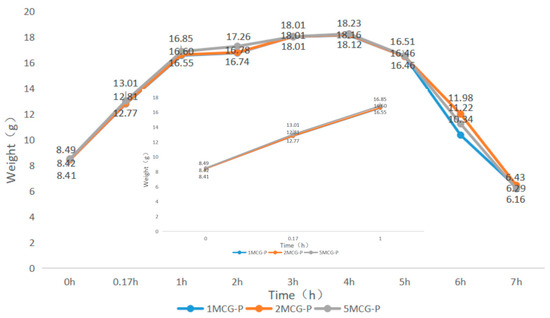 When bone scaffolds are used in regenerative medicine, the preliminary analyses of degradable materials need to be examined for fluid absorption capacity. The swell property is responsible for the swell performance of polymer matrices, after which the diameter of bone scaffolds is increased, which facilitates cell adhesion and internalization, which is imperative to improve the regenerative process [29]. In Figure 9, an immersion time of 0–0.17 h is set as the initial test time point because moisture-absorbent materials exhibit a significant swelling performance after being immersed for ten minutes (cf. the inset of Figure 9). A 1-h immersion speeds up the increase in weight of 5MCG and likewise, a 2- and 3-h immersion leads to a significant increase in the weight for 2MCG-P. With an immersion time of 3–4 h, 1MCG-P, 2MCG-P, and 3MCG-P show a comparable increase in wet weight. 1MCG-P, 2MCG-P, and 5MCG-P start to have flaking edges which in turn reduce the wet weight after being immersed for 4 h, and they show a remarkable decrease in the weight after a 5-h immersion, and finally have a lower wet weight than the dry weight after a 7-h immersion because gelatin is slightly dissolved in water.