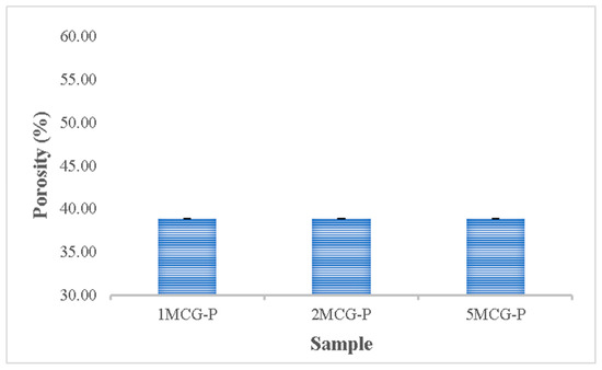 The porosity of bones indicates the volume taken by those constituent voids in bones. Pandithevan et al. found that cortical bone porosity was 40–60% [26]. 1MCG-P, 2MCG-P, and 5MCG-P have a comparable porosity of 40–60%. Compared with Figure 10, the proposed bone scaffolds have a normal porosity level as well as a porous structure with interconnected pores. This result indicates that this study manufactures bone scaffolds with a required pore size range and an even pore diameter distribution. Moreover, the statistical analyses also indicate that there is no significant difference in the porosity among all samples, and the average porosity is 38.854%.