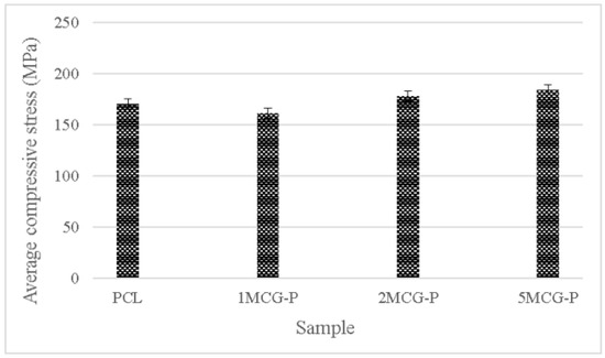 To sum up, CS is a natural biopolymer with widespread availability. Its absorption, biodegradability, and biocompatibility make it ideal for extensive application [30], the proposed porous gel consists of three minerals (i.e., MMT, ZnO, and TiO2) individually, and the group containing MMT outperforms the other two groups. Therefore, CS/Gel/MMT porous gel with constitutional 0.1 wt%, 0.2 wt%, and 0.5 wt% is used for further comparison. Because porous gel has lower strength, in compensation polycaprolactone is incorporated to form bone scaffolds. The compressive strength test is conducted afterward. Polycaprolactone is commonly used for reinforcement in order to simulate the mechanical strength of ECM polymer as seen in the study by Wang et al. [31]. Different reinforcing methods provided bone scaffolds with different compressive strength levels. For example, Liu et al. combined polycaprolactone and collagen to form a slurry, from which the solvent was then removed, thereby forming hollow stents with the compressive strength being 0.5–2.0 MPa. Moreover, a 3D printing technique could form stents with a compressive strength of 3–6 MPa [32]. In past research, CS also has considerable potential in the biomedical field for solution casting. Comparatively, in past research, CS also has considerable potential in the biomedical field for solution casting [33], strengthening polycaprolactone via the melt-casting mold method improves proposed bone scaffolds in terms of compressive strength. Furthermore, the compressive modulus is highly dependent on the microstructure of matrices. A previous study indicated that the compressive modulus was inversely proportional to porosity and pore diameter. By contrast, an increase in the pore thickness or a decrease in porosity had a positive influence on the compressive modulus [34]. Figure 11 shows that the average compressive strength is 170.207 MPa for polycaprolactone (PCL), 161.289 MPa for 1MCG-P, 178.239 MPa for 2MCG-P, and 183.966 MPa for 5MCG-P. Samples can be ranked from lowest to highest according to the average compressive stress as 1MCG-P, 3MCG-P, and 5MCG-P. Because the difference in porosity is rather small, the compressive stress increases as a result of increasing pore diameter. Coe et al. reported that compressive strength is 150 MPa for compact bones, 4–15 MPa for spongy bone, 161.289 MPa for 1MCG-P, 178.239 MPa for 2MCG-P, and 183.966 MPa for 5MCG-P. The proposed bone scaffolds in this study have comparable compressive strength with compact bones [35,36,37].