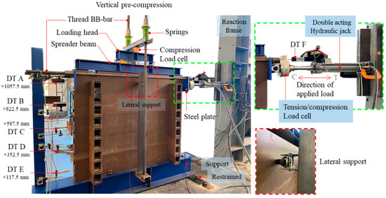 Log-wall specimens were attached to the steel beam support and restrained to a rigid floor by LF-AB. Five displacement transducers (DT) were installed with a rigid column to measure the horizontal sliding of each log-element (DT A to DT E), as illustrated in Figure 4. DT F was used to measure the distance of the double-action hydraulic jack with 100 kN capacity (C is compressive direction and T is tensile direction). The top log-element was clamped with two steel plates and thread BB bars for load transfer. To reflect the actual behavior of the log-wall, the walls were subjected to two directions of load. The first direction of vertical load represents the applied gravity load while the second direction represents the lateral load from wind force. The double-action hydraulic jack was restrained to the reaction frame to apply the loading protocols (Figure 5) to the top log-element. To apply a gravity load corresponding to the working condition of a one-story log-house with a typical roof span of 4 m, the loads [32] consisted of a roof cover dead load (DL) of 0.049 kN·m−2, a roof structure DL of 0.49 kN·m−2, devices and ceiling DL of 0.196 kN·m−2, WPVC composite log-element self-weight of 0.827 kN·m−1 per element, and a roof live load of 0.49 kN·m−2. A total load of 2.37 kN, excluding the weight of the instruments, was applied to the specimens. The vertical load was created by thread BB bars and distributed to specimens by loading the head and spreader beams. The wide-flange WF 100 × 100 × 6 × 8 mm was selected as the spreader beam which was used to distribute the vertical load to the wall bearing specimen. This technique was recommended by the previous works of Branco and Araújo [12]. The selected spreader steel beam has high enough of the beam stiffness and the deflection during vertical pre-loading is not occurred. Therefore, the applied forces on the wall were assumed to be uniformly distributed load. Regarding the practical application, the panel can deform or expand (overturning) under lateral loads. To maintain the approximate constant gravity load level during the panel deformed, the steel spring were inserted at one end of each thread BB bars and the gravity load level was monitored by load cell (30 kN capacity). The use of spring allowed the wall specimens to deform (uplift) while the vertical load was maintained, which corresponded to the behavior of building under lateral load, this technique was applied from previous research works [12,14,30]. In this research, the in-plane lateral load was emphasized. Thus, rubber wheels were installed in the middle of the top log-element for lateral support in out-of-plane direction on both sides of the panel (Figure 4).
