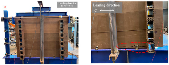 A cyclic horizontal load with the rate of slip 0.2 mm·s−1 was applied according to BS EN 12512:2001 [34], as presented in Figure 5b. An estimated yield slip (Vy, est) of 5 mm was determined as the average yield slip of CJ-SHL and LF-AB obtained from previous research [30]. The cyclic tests were controlled by lateral displacement. Positive displacement was considered as the compressive direction (C); negative displacement was considered as the tensile direction (T).