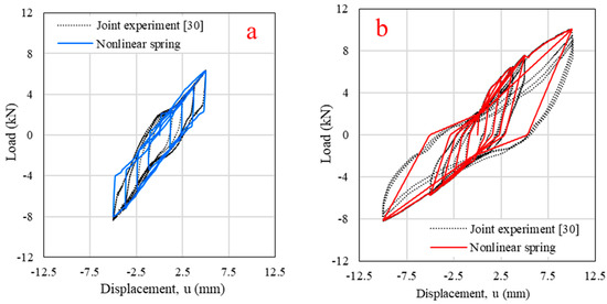 Parameter α1 was used to control unloading stiffness; the reload stiffness was controlled by parameter α2. Parameter β was used to define the slope of the pinching branch (β1 for unloading and β2 for reloading). Parameter η defined the elastic stiffness degradation [17]. To control the load–slip path of the LF-AB connection, α1 = 7, α2 = 5, β1 = 0.99, β2 = 0.95, η = 1.0 were defined. Link-element calibrations in the single-joint cyclic test are presented in Figure 9. The difference in total energy absorption between the actual experiment and the single-joint model met the acceptance criteria.