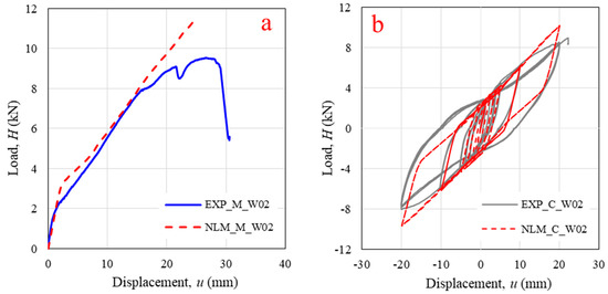 Comparison of experimental (EXP) and finite element model (FEM) results for specimen W02 under (a) monotonic loading; (b) cyclic loading.