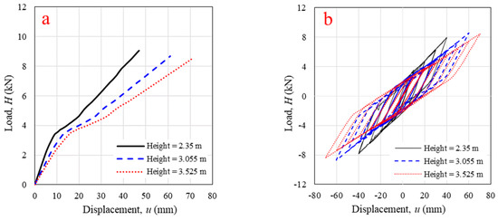 The height of the wall was studied first. The wall height varied from 2.35 m (10 log-elements) to 3.055 m (13 log-elements) and 3.525 m (15 log-elements). As shown in Figure 13a, the increase in wall height from 2.35 m to 3.525 m resulted the 42.8% lower of initial stiffness, 31.5% lower of final stiffness, and 6.49% lower of maximum lateral load capacity with linear relationship because the wall slenderness increased. The cyclic responses of the wall with different heights are presented in Figure 13b. When the wall height was increased to 3.055 m and 3.525 m, the cyclic stiffness decreased by 27.5% and 39.0%, respectively, with the last displacement level. The number of conner joint increased with increasing of wall height, therefore, the spring in the FEM also increased in series which directly affected to the wall stiffness. Similar results were obtained with solid timber log-wall panels in previous research [12,21]. At the last displacement level, panels with heights of 3.055 m and 3.525 m generated 34% and 78.8% more energy dissipation. Thus, increasing panel height unfavorably affected lateral load capacity, monotonic stiffness, and cyclic stiffness, however, the wall can dissipate higher energy as wall height increase.