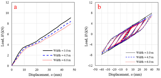 Horizontal in-plane lateral load versus displacement from validated numerical modeling with different log-wall widths under (a) monotonic loading; (b) cyclic loading.