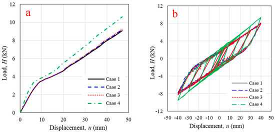 Based on the wall uplift observed in the experiment, the number and position of log-foundation connections were considered. Four connection configurations were implemented, as shown in Figure 12. Cases 1–3 emphasized the connection spacing; Case 4 focused on the connection position. The FEM analysis indicated that the spacing of the log-foundation connection did not significantly influence the monotonic and cyclic responses of the WPVC composite log-wall, as illustrated in Figure 15, due to the wall overturning. The maximum wall uplift occurred at the edges of the panel due to the loading directions. Thus, adding log-foundation connections around the center of the panel was ineffective. FEM analysis revealed that moving log-foundation connections from the original position (Case 1) to the edges of the panel (Case 4), which expanded the resisting moment arm, increased 48.1% of initial stiffness, 23.4% of final stiffness, and 16.8% of lateral load capacity and also increased the hysteresis parameters in terms of cyclic stiffness (19.4%) and energy dissipation (15.3%) because installation of log-foundation connection as Case 4 had highest overturning moment arm. These results are consistent with those from a solid timber log-wall in which the connections were transferred from the main log-element to attach the orthogonal log-elements [12]; the experiment indicated that moving the log-foundation connection away from the center of the log-wall produced better performance under cyclic horizontal displacement [12]. A summary of parametric studies is presented in Table 2.