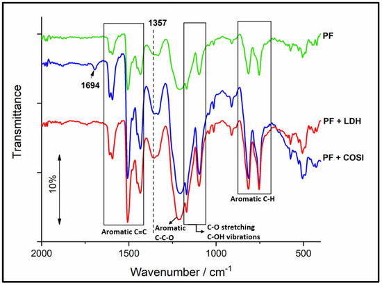 In the FTIR spectrum of the hybrid resins with nano-SiO2, we expected a peak at approximately 1100 and 810 cm−1 [33]. However, the concentration of the additive was too low, and at the same time, the peaks of the basic resin were prominent in this region, so that they overlapped. The peak, representative of ZnAl-LDH (1357 cm−1) is characteristic of a free carbonate anion and represents the carbonate stretching mode [34,35].