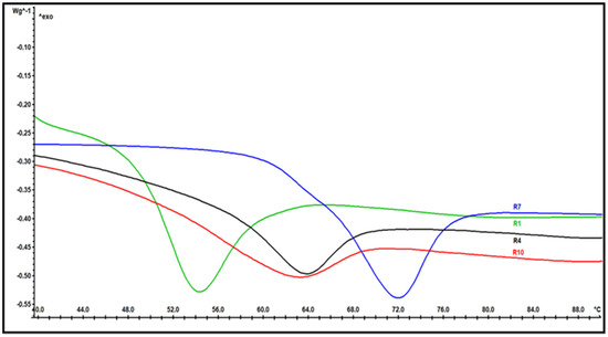 Differential scanning calorimetry (DSC) thermograms of four synthesized resins (basic–R1, with aminosilane–R4, with COSI–R7, and with ZnAl-LDH–R10).