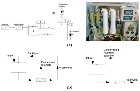 The scheme of pilot-scale UF process. (a) UF process and the photo of UF modules; 1: Tank, 2: Conductivity meter, 3: UF module, 4: Flowmeter. (b) Varied operating methods.