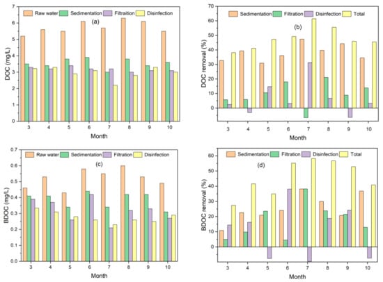 DOC and BDOC removal in the water treatment plant in different months. (a) DOC concentrations; (b) DOC removals; (c) BDOC concentrations; (d) BDOC removals.