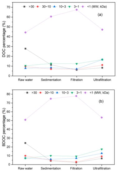 Figure 3 shows the percentage change in different MW species in DOC and BDOC during various treatment processes. Organics with different MWs in the water samples were separated using membranes with MW cut-offs of 1, 3, 10, and 30 kDa. The decline in both DOC and BDOC with MW > 30 kDa was observed after sedimentation and sand filtration; while DOC and BDOC with MW < 1 kDa showed opposite trends, because of the removal of those with large MW, indicating the limited removal of both DOC and BDOC with small MW during conventional water treatment processes. The coagulants in the conventional treatment process are easy to associate with macromolecular organic matter with strong hydrophobicity, resulting in electrical neutralization and adsorption bridging, which can destabilize and form large flocs []. For the hydrophilic organic matter with smaller MW, it is not easy to combine it with coagulants or for it to be adsorbed by the flocs. Therefore, the conventional processes need to be enhanced to further remove BDOC.