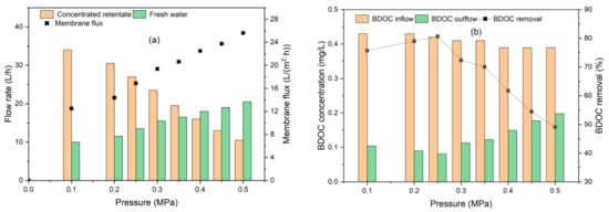 Effect of UF operating pressure. (a) Membrane flux; (b) removal of BDOC.